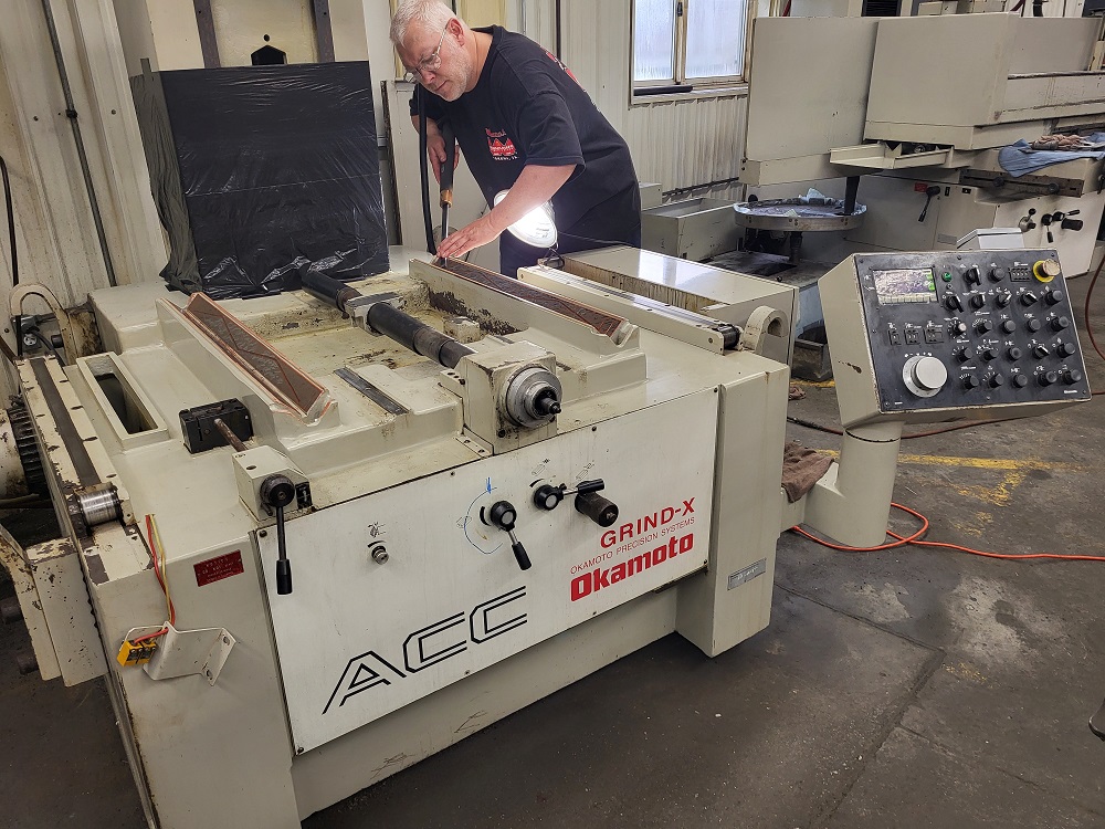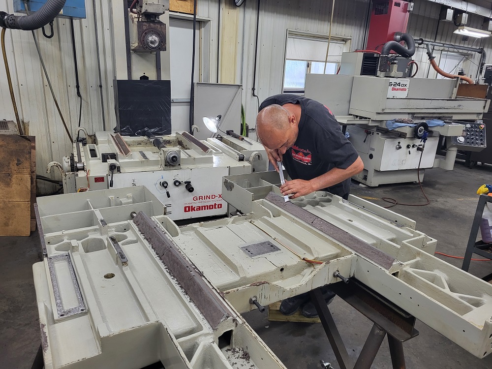 In 2025, Waymint enters its 15th year of independent success. Our on-site travels in scraping Okamoto surface grinders have taken us to both the east and west coastlines, to the Canadian and southern borders and approximately 40 non-border US states. Customers love what we do and the people at these customer locations love seeing the service happen right before their very eyes. The installation and return of OEM accuracy back into Okamoto grinders happens over the course of approximately ten business days. The disassembly of the grinder and clean-up of all removed parts is part of the process. Worn turcite too far eroded to rescrape gets replaced on-site and scraped-in following the curing of the epoxy adhesive and the trimming down of the oversized turcite strips. Rulon is a desired replacement for old turcite in many cases. Either way it all gets done, accuracies are better than new machine accuracies, the machine is reassembled, new oil flows through the machine’s system, oil filter is cleaned, hydraulic oil pressure is optimized and the table top, chuck bottom and topside are ground in with freakish precision suitable for NASA, Tesla and aerospace rocket parts. Seeing is believing!