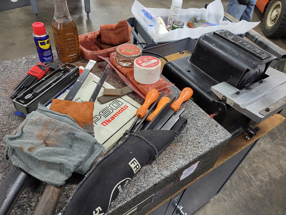 A day had come where I was tasked to scrape a highly deteriorated Okamoto 16 x 24DX on-site at a customer’s location, in front of all those machinists looking on with heavy doubt. This customer was rebuilding their own Okamoto grinder. They were doing great until the challenge of restoring the V-way accuracies was at hand. They had to call in a pro. I was tapped to answer this call. I gathered my gear and headed out to the site. A group of people surrounded the machine in utter confusion as I arrived as a 39 year old man with a small bag of tools and the knowledge they needed for the sticking point they were confronted with. With the machine largely disassembled, both the saddle and table had been put back upon the machine base in their respective locations. With everything disconnected from the saddle and table, the two heavy parts just sat there, immovable. “We can’t get these pieces to move!” They said. A group of three large men physically tried pushing the table along its V-way guideways, but to no avail. It wouldn’t budge. They brought in a forklift, butted the forks together and approached an end of the stubborn unmoving table. Just before the forks made contact, an employee raised up a two foot length of a wooden 4x4 and held it horizontally along the table’s casting end and the forklift fork tips made contact with the 4x4, acting as a cushion between the forks and machine table. The wood raising guy stepped away and we all watched what happened next. The forklift operator was given the order to begin depressing the gas pedal as the gearshift was in the forward operating position. The revving of the forklift engine gradually ramped up and yet the table remained motionless. The revving engine hit a fever pitch as I looked on at the surrounding men, many of which were smoking cigarettes and board with this particular spectacle, having seen it many times before. I looked back to the forklift with the engine nearing maximum output. The front forklift rubber wheel then suddenly spun in place, then suddenly re-gripped the floor and the forklift and table surged forward a foot of travel then stuck again. The fork truck operator then backed off having shown me the problem, wood falling to the floor. “Can you fix that?” He sternly spoke aloud to me over the crowd as he shook his head in a No Way fashion, suggesting I was not the man for the job. My reply was classic and immediate. “Where’s your coffee pot?” At this point, they all knew I was about to settle in to execute on this impossible challenge. 26 hours and two days later (2 13-hour days), the job was done!